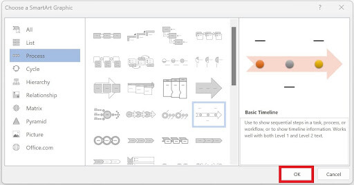- In the SmartArt Design tab, in the Layouts group, click the bottom arrow on the right side. Here, you can access all SmartArt graphic options. Click on the timeline layout you’d like to use.