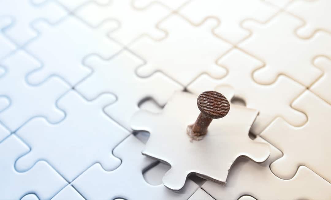 A rusty nail pierces a puzzle piece that is not correctly aligned.