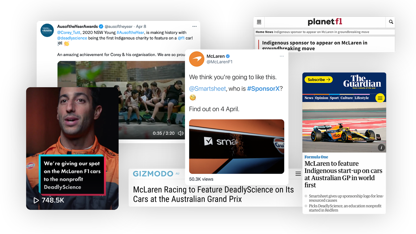 We decided to reimagine what a sponsorship can do in the name of what Smartsheet believes in: work that matters. We asked ourselves, What can a logo on a car really accomplish? In a first-of-its-kind initiative in Formula 1 history, we extended the benefits of our sponsorship deal to put a worthy cause front and center. We replaced our logo on the McLaren F1 cars with that of DeadlyScience, a nonprofit whose mission is to provide STEM resources and mentorship to Aboriginal and Torres Strait Islander youth. They were the first indigenous organization to be featured in an F1 race–groundbreaking in so many ways.