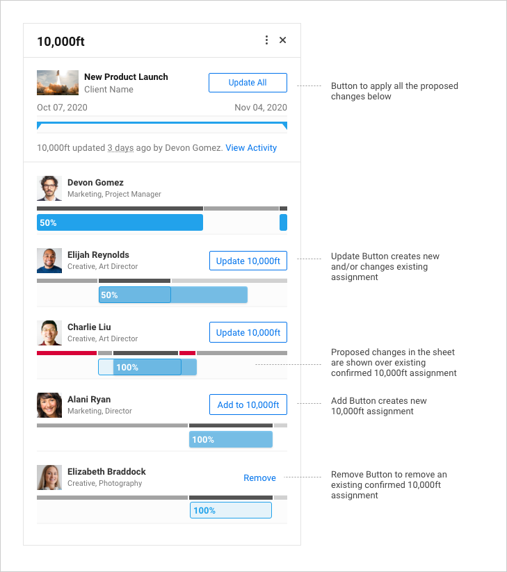 We've also simplified bar visuals with fewer states that more directly and consistently represent assignments in 10,000ft vs. the Smartsheet project sheet.