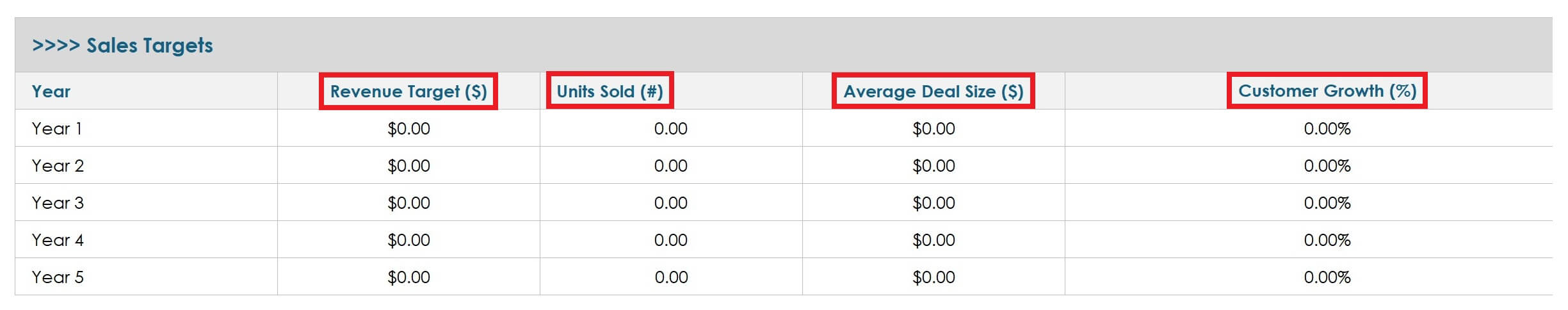 13. In the Sales Targets table, enter each year's revenue target, units sold, average deal size, and customer growth percentage.