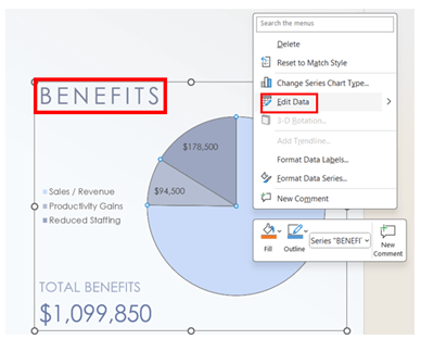 - Click on the Benefits pie chart and right-click. Select Edit Data.