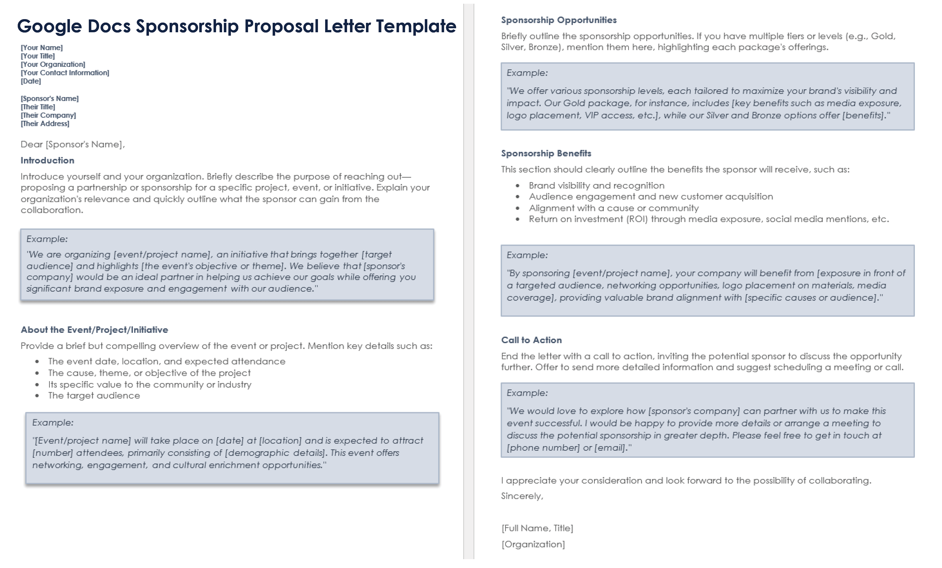 Notable Template Features: The five-part letter format features sections describing sponsorship opportunities and benefits. This template includes examples and guidance, from the introduction to the call to action.