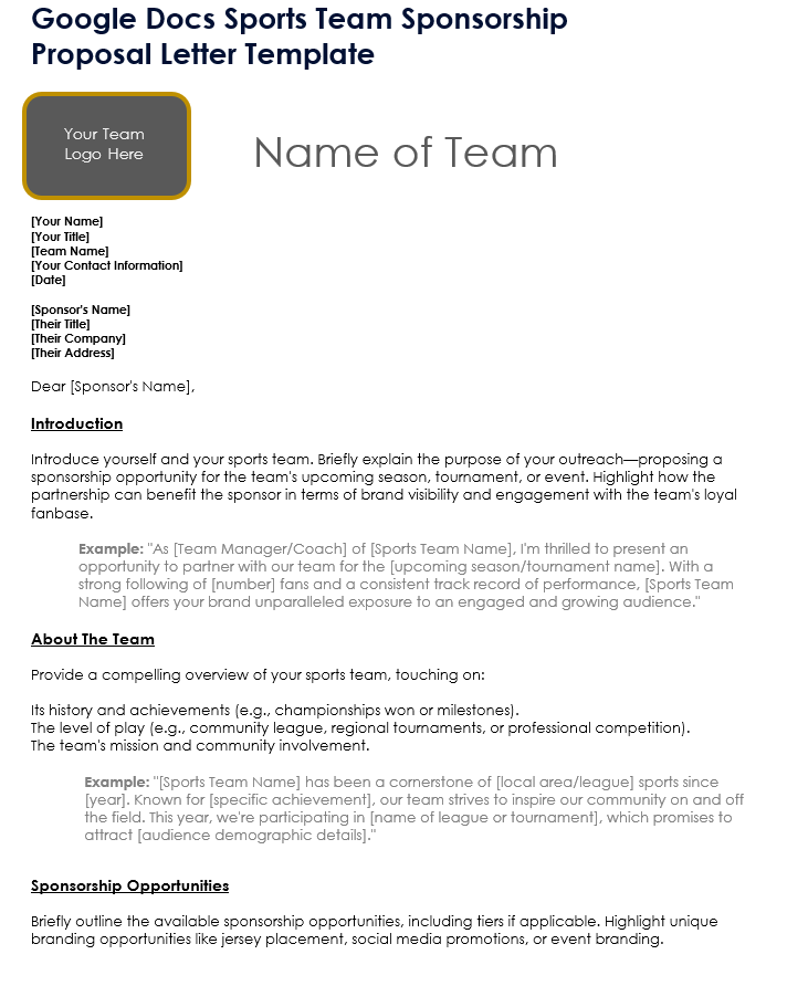 Download the Sports Team Sponsorship Proposal Letter Template for Google Docs