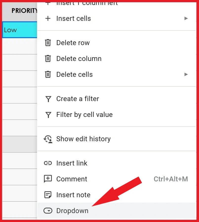 You can change the priority colors by selecting Low, Medium, or High in a Priority cell. Next, right-click and select Dropdown from the menu.
