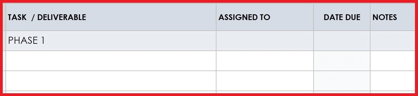 Click the cells under Task / Deliverable and enter the project tasks. In the Assigned To column, fill in the names for project task assignments. Enter the due dates in the Due Date column. Use the Notes column for additional project task information.