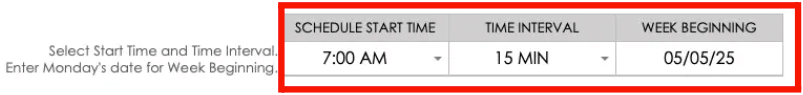 5. Locate the Week Beginning field in cell I4, and enter the date for the start of the week you would like to schedule in the format MM/DD/YYYY.