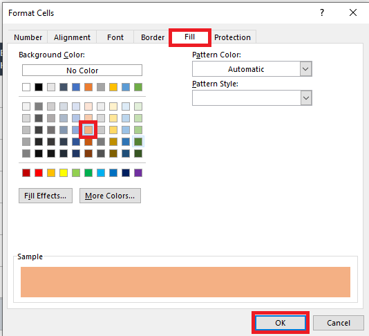 - Click the Fill tab. Select your desired fill color, then click the OK button.