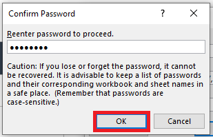 - Pro Tip: Use the same password that you created to unprotect your range of cells above to avoid greater confusion.