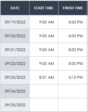 - Click on the Finish Time field for the first day of the week, and enter the employee’s finish time in the same format.