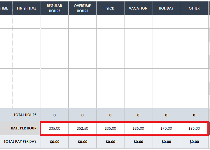 - In the bottom section of the template, fill in the employee’s rates of pay by clicking on each field in the row and entering the hourly pay rate for each of their regular, overtime, sick, vacation, holiday, and other hours.