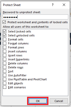 - Create a password to unprotect the sheet and enter it in the Password to unprotect sheet field. Then click the OK button.