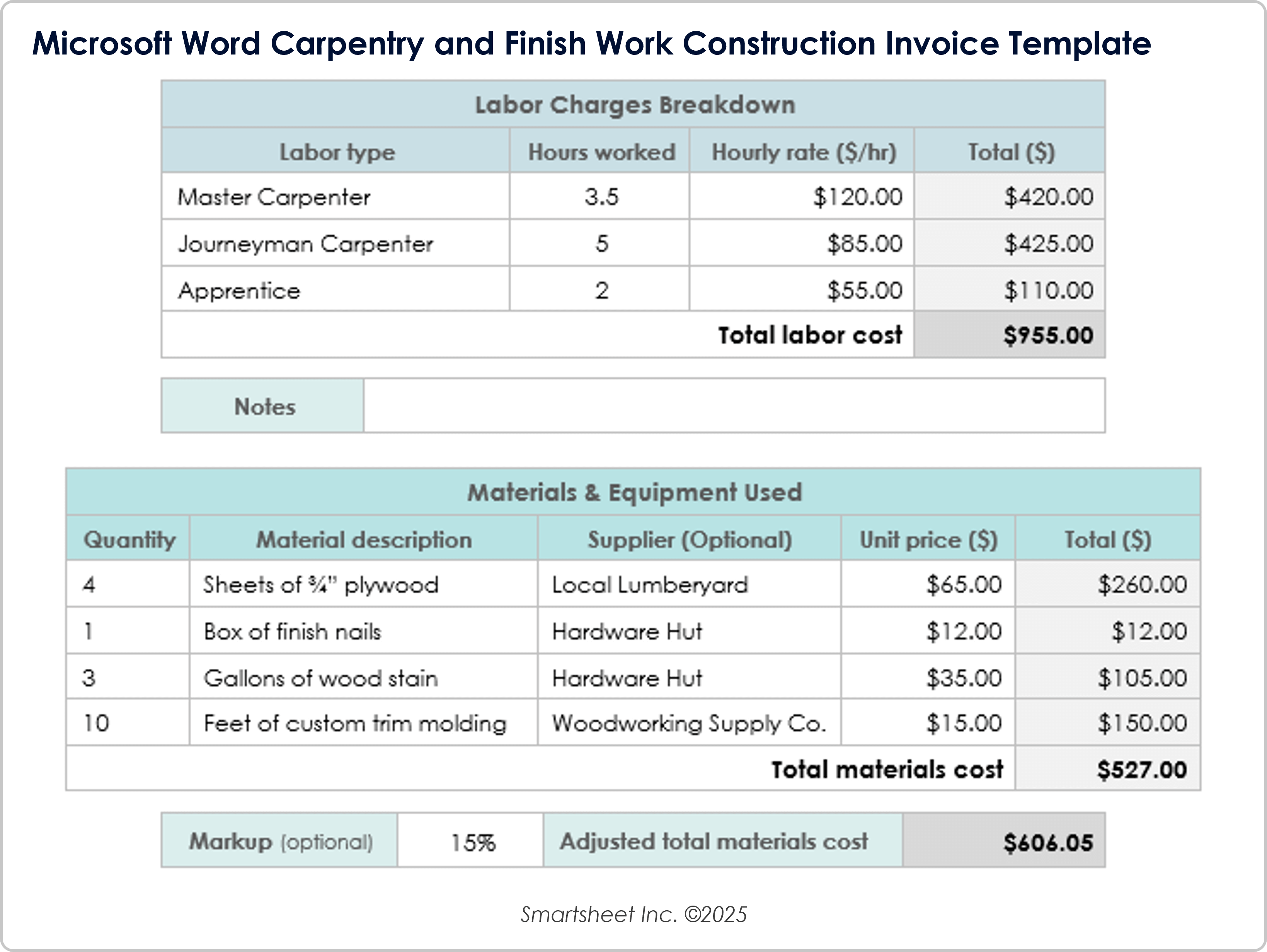 Download the Carpentry and Finish Work Construction Invoice Template for Microsoft Word