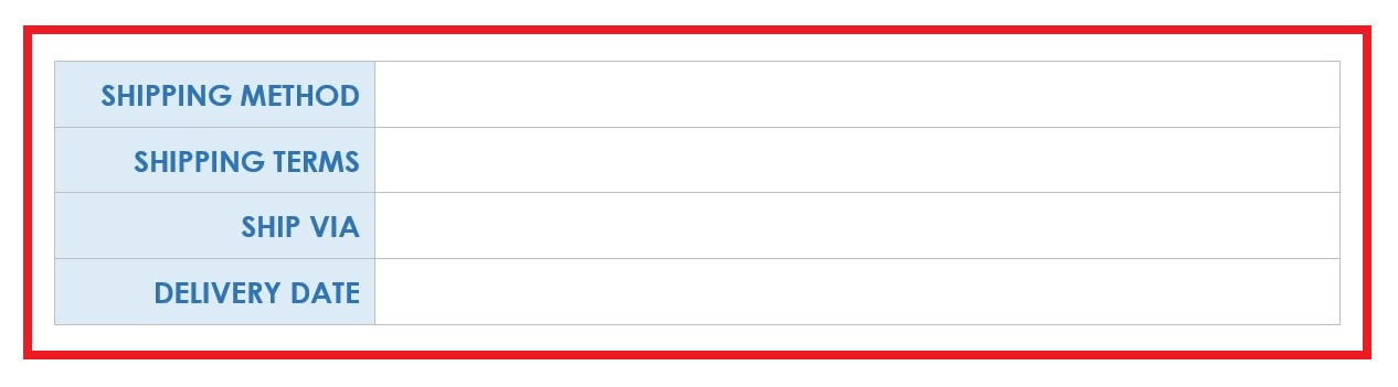 Notable Template Features: This printer-friendly template features wide fields for handwritten entries and includes standard purchase order form sections such as item descriptions, prices, shipping terms, and more.