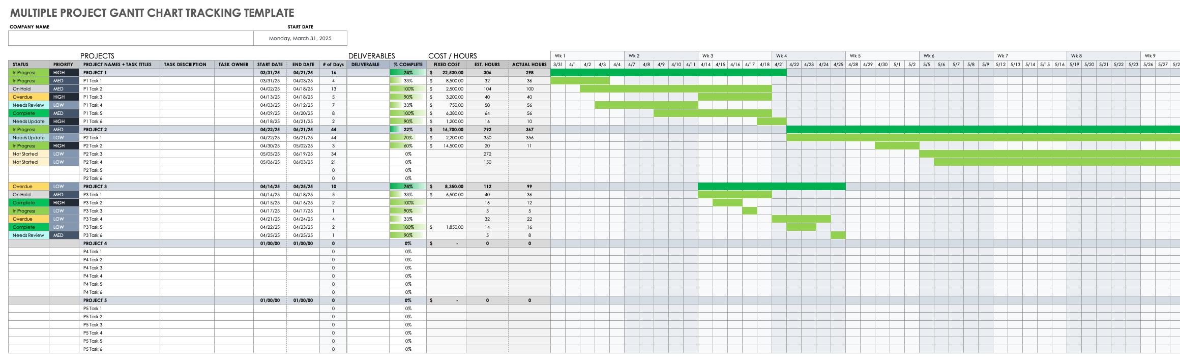 Use this simple multiple project tracking template to standardize your project tracking process and ensure that you have up-to-date information on all of your projects, including the statuses of individual tasks, team member assignments, and descriptions of deliverables. For each project, enter the name, task details, percentage complete, and estimated total hours and costs. Use the week-by-week Gantt chart as a presentation-friendly overview to indicate how your individual and collective projects are progressing.