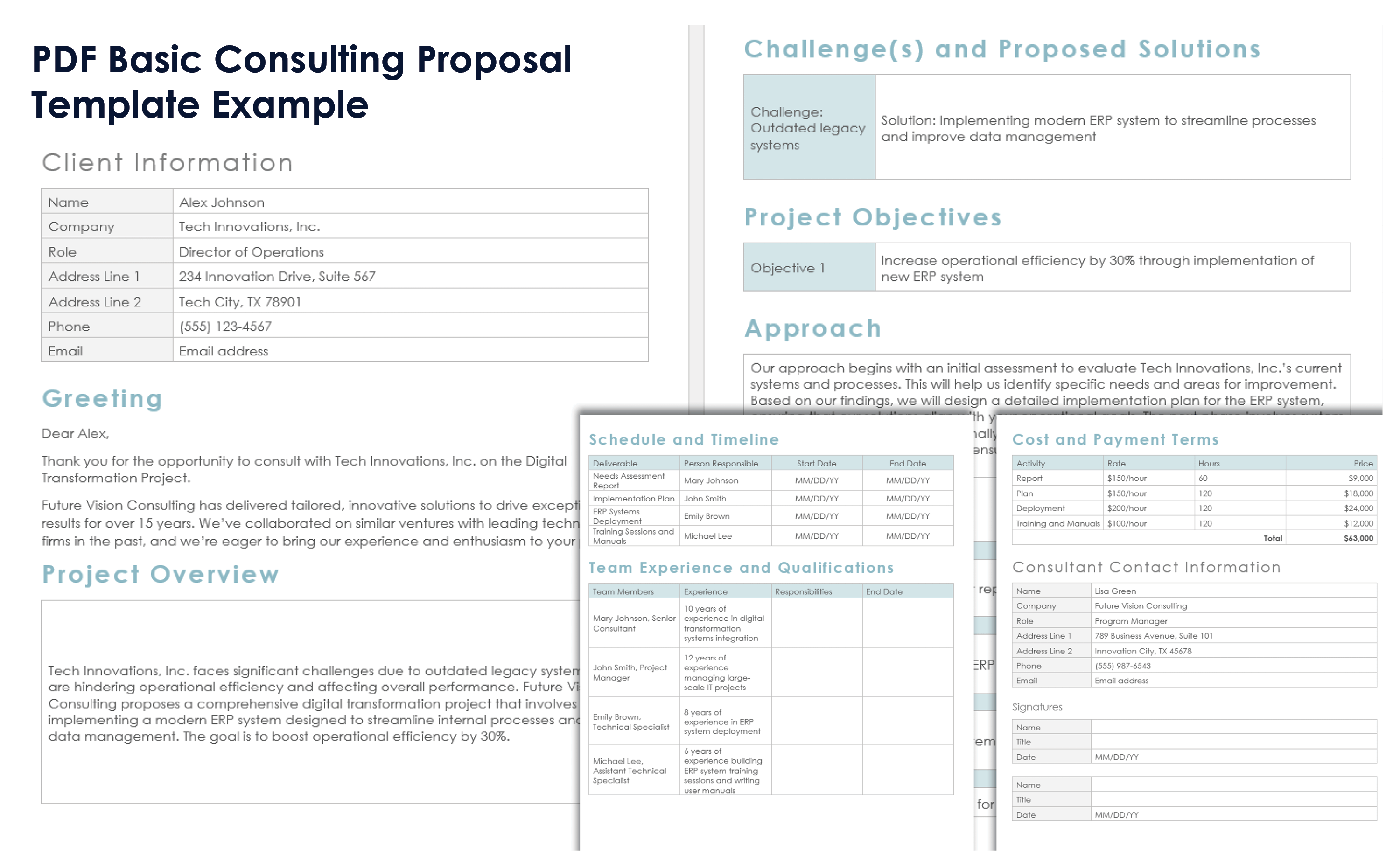 When to Use This Template: Use this basic consulting proposal template — available with or without sample data — to formally greet potential clients and explain your approach to their challenges. This universal template is ideal for initial client meetings or small projects with limited scopes and short timelines.