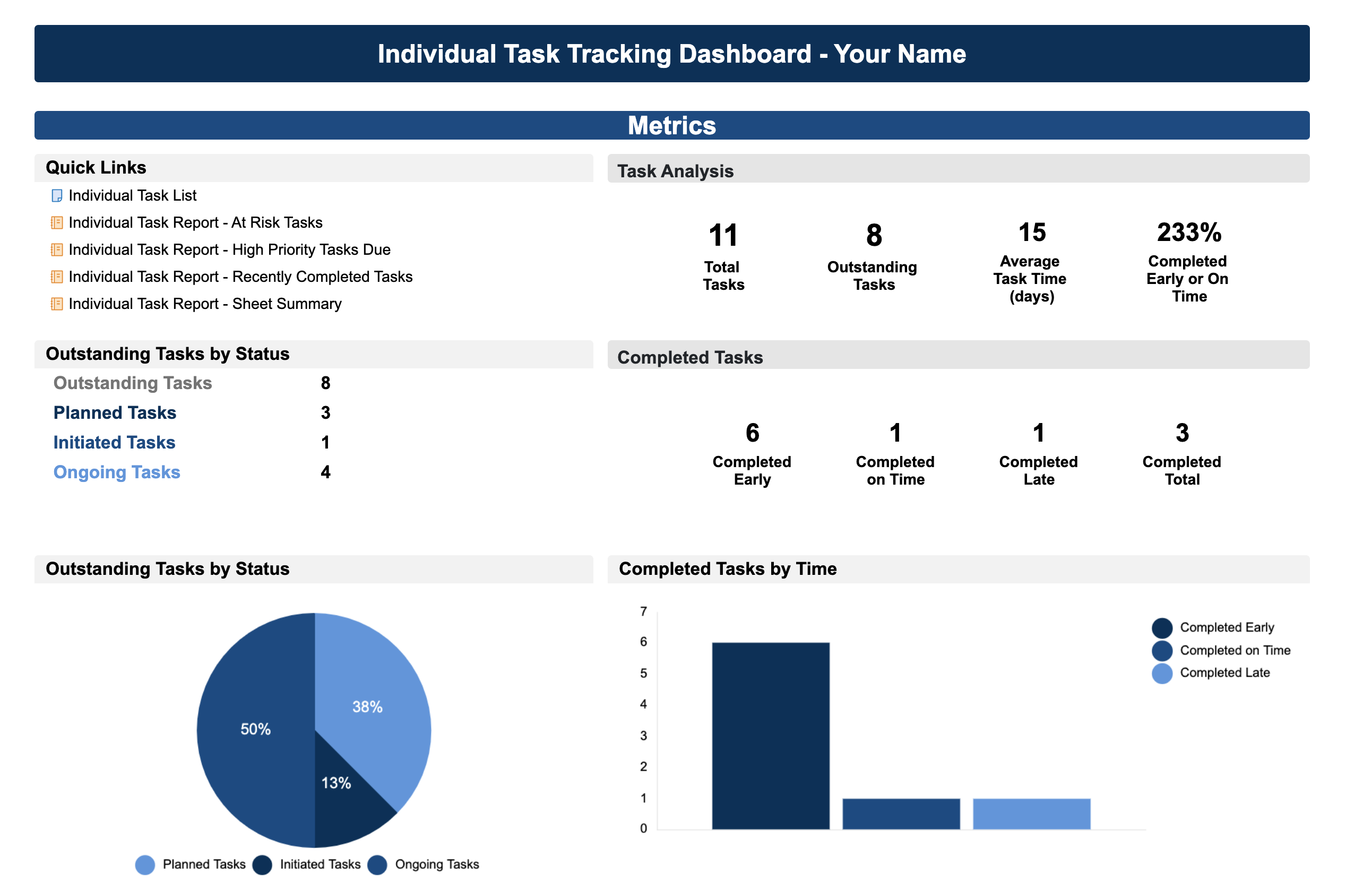Using the powerful core capabilities of Smartsheet sheets, reports, and dashboards, Silverio engineered a solution-turned-template that enables individuals to enhance how tasks are planned, managed, and visualized. The following columns help users keep track of the tasks: points of contact and notes on how they like to work, task priority, health, date, metrics, status, and predecessor and successor columns to see how everything is related. Users rely on automated alerts for critical tasks and can generate reports and sheet summaries to gain a complete picture.