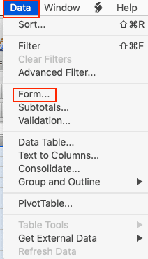 The steps for adding, finding, editing, and deleting a record are the same as for Excel 2016, so follow the steps above. The appearance may be slightly different. In general, the steps are to select an area in the sheet, insert a table, add titles at the top of the columns, and then find the form option in the data menu.