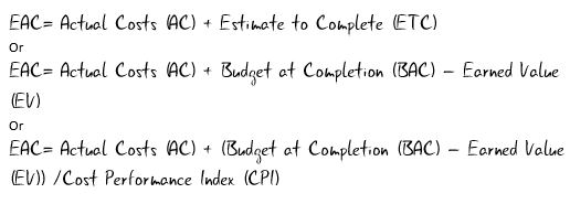 • Estimate at Completion (EAC): This is the total cost of the project at the end. This is often also called latest revised estimate (LRE). EAC is a forecast and may be calculated as the project progresses. There are three ways to calculate EAC, depending on your situation: