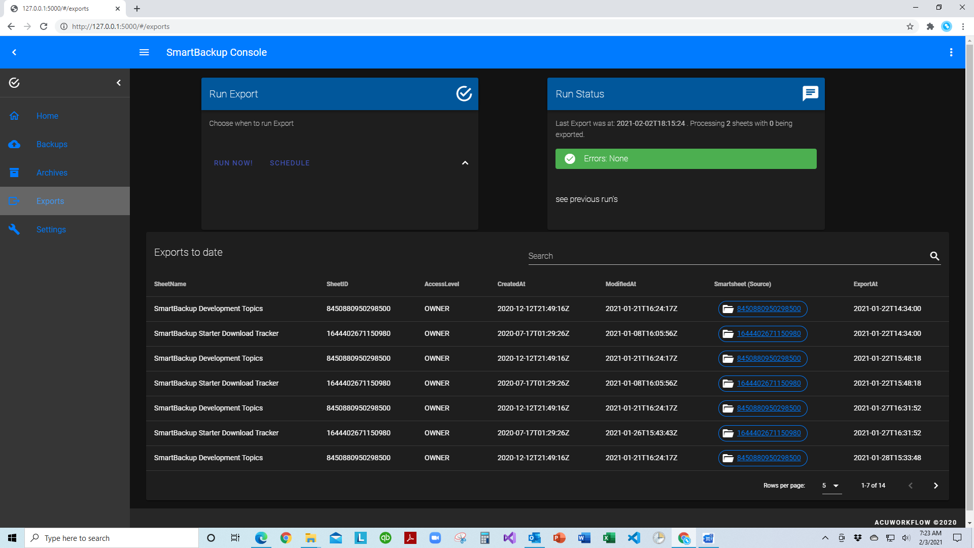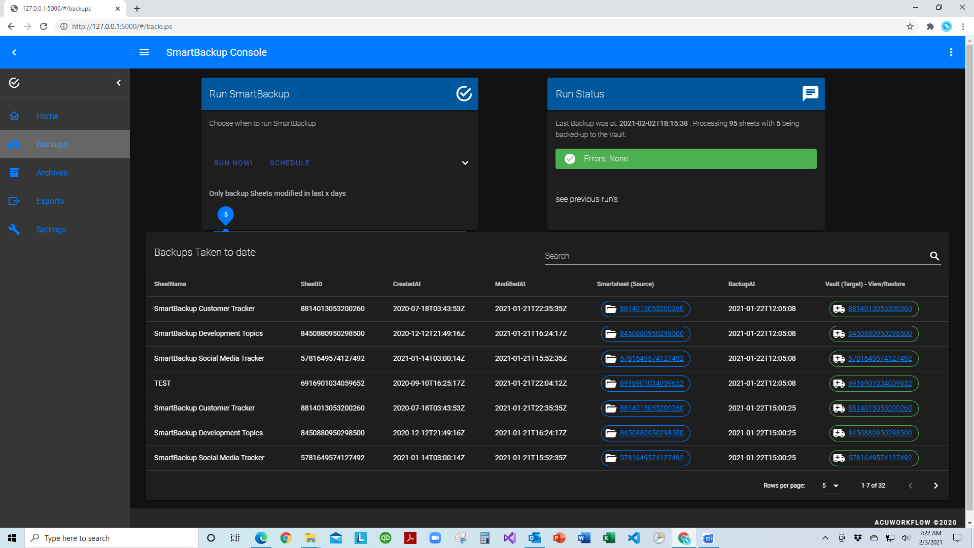 SmartBackup addresses the backup and restore needs of all Smartsheet licensed users. It includes a backup function, an archive function, and an export function, and provides full-fidelity backups of your Smartsheet sheets. This means that you can easily restore rows, data, and sheets including Conditional Formatting, Formulas, Cell Links, Forms, and Attachments. It provides additional features not available in any other offering, such as a catalog to keep track of what has been backed-up, archived, and exported, and support for DRP Recovery and Compliance/Governance requirements.