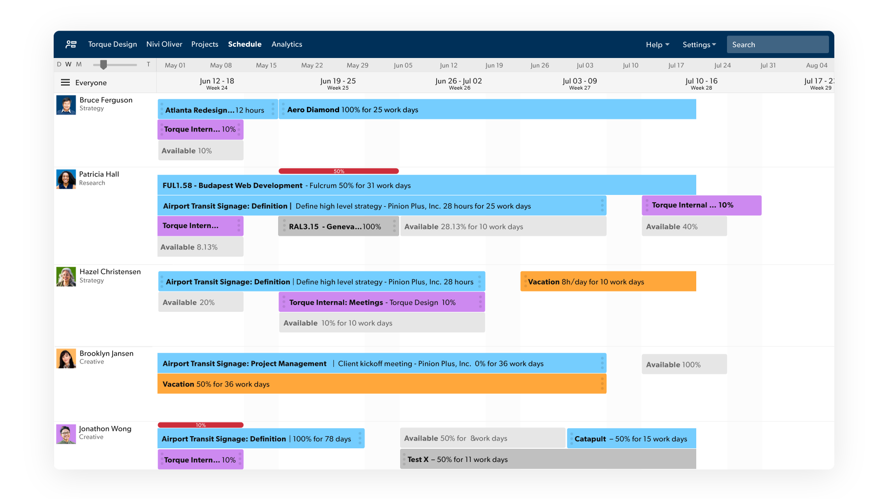 Effectively find and schedule the best project team, resolve staffing conflicts in real time, and forecast hiring needs.